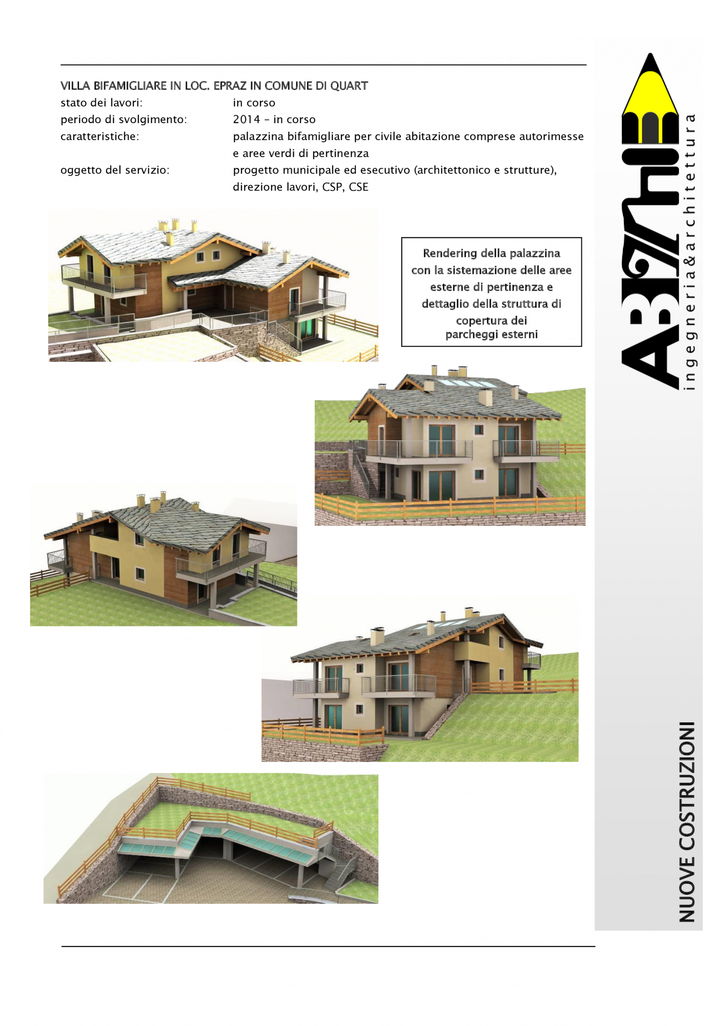 Lo Studio Tecnico Abithe ha da sempre seguito con successo la progettazione e la direzione lavori per la realizzazione di edilizia per committenza privata. L’attività è stata svolta in diversi comuni della Valle d’Aosta ed ha interessato sia interventi di nuova costruzione, sia di recupero del patrimonio edilizio esistente.